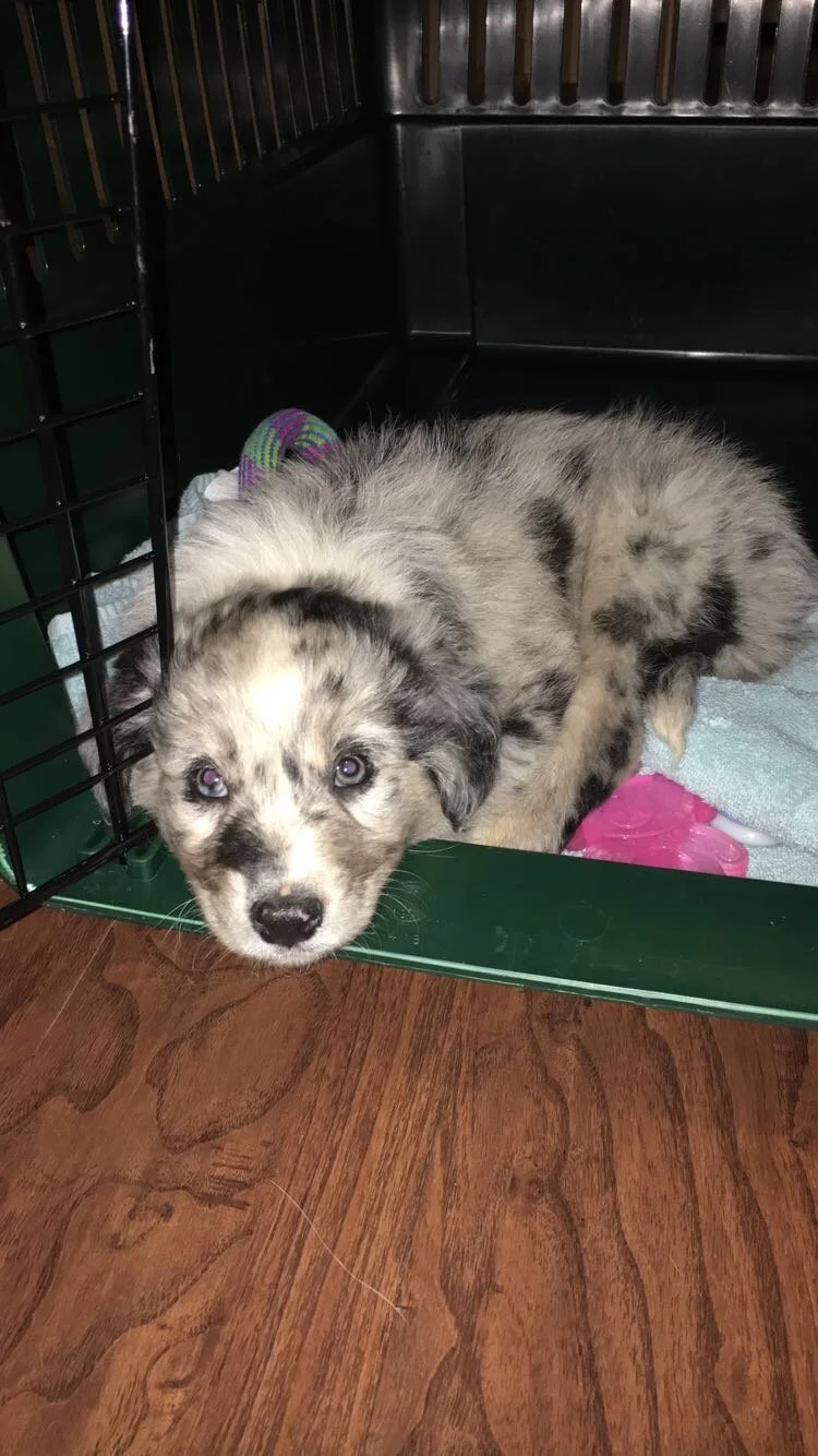 Tazzy is an in-tact blue merle male, although I don’t plan on using him as breeding stock. He has a great temperament, and gets along well with my other in-tact male, even when my females are in heat. He helps teach the new dogs as they come, and is a great baby sitter.